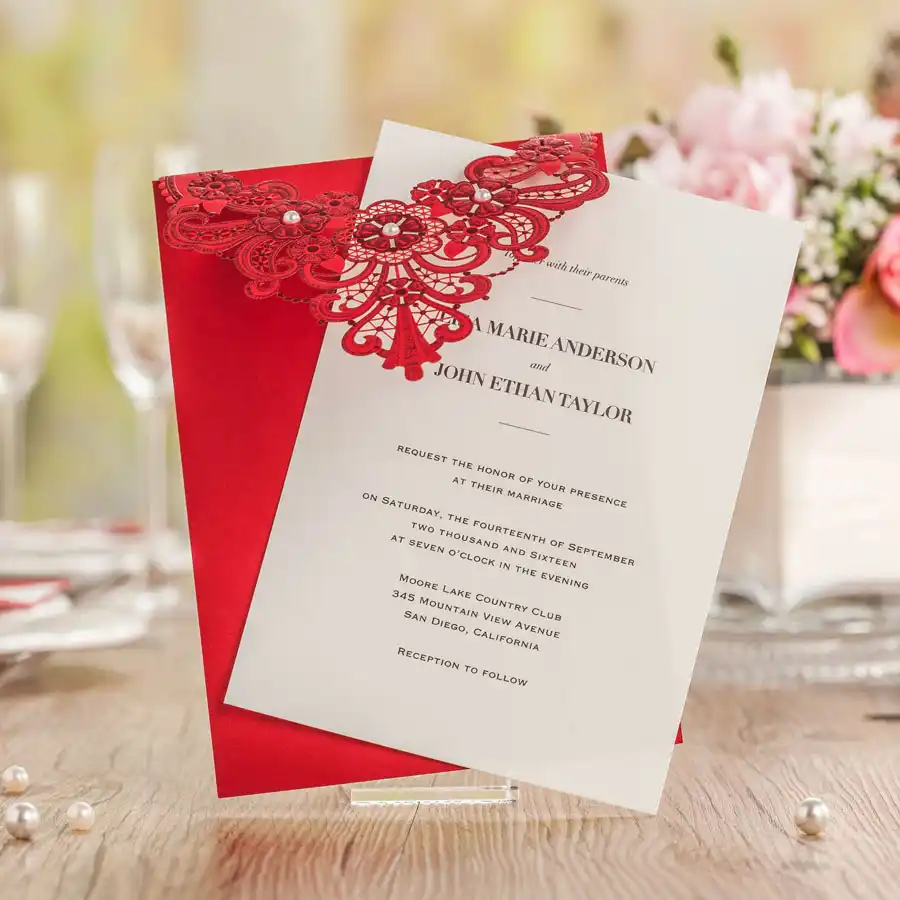 Red Lace Flower With Ribbon Wedding Invitations Elegant Laser Cut Hollow Flora Birthday Party Greeting Cards Cw103 Wood Wedding Invitations Asian